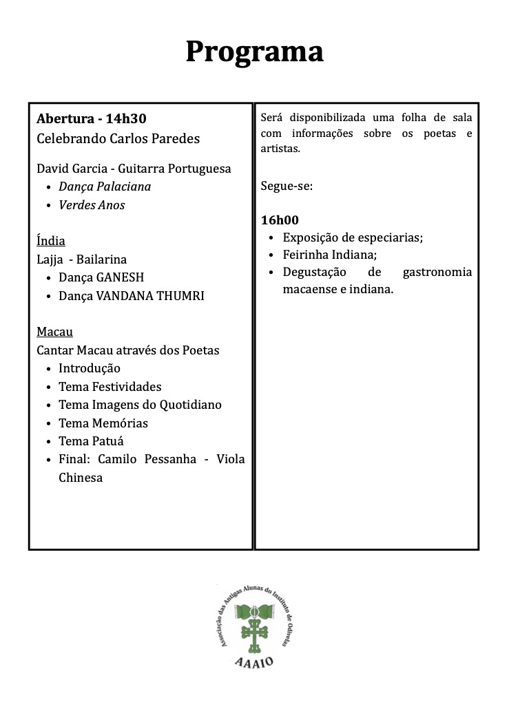 14h30 - 16h00 – No Teatro Dom Luiz Filipe iremos viajar pela Ásia: Macau e Índia. Haverá um périplo de música e dança.